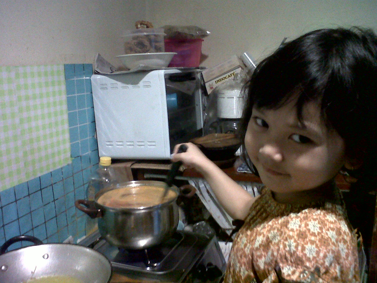Walau cuma kebagian ngaduk dan masukin sayur ke dalam panci, udah berasa seneng banget dan bangga bisa masak sup sendiri. Sesuai selera krucils, sup merah kali ini pure tomatnya tidak terlalu kental. Sebagai penguat rasa tomatnya digantikan dengan saus tomat. Paling lucu ekspresinya waktu kusuruh mencicipi dengan sendok kecil kuahnya kurang apa. Dahinya berkerut dan matanya menerawang ke langit-langit.. " Udah udah mommy.. Ga kurang asin kok udah pas!"